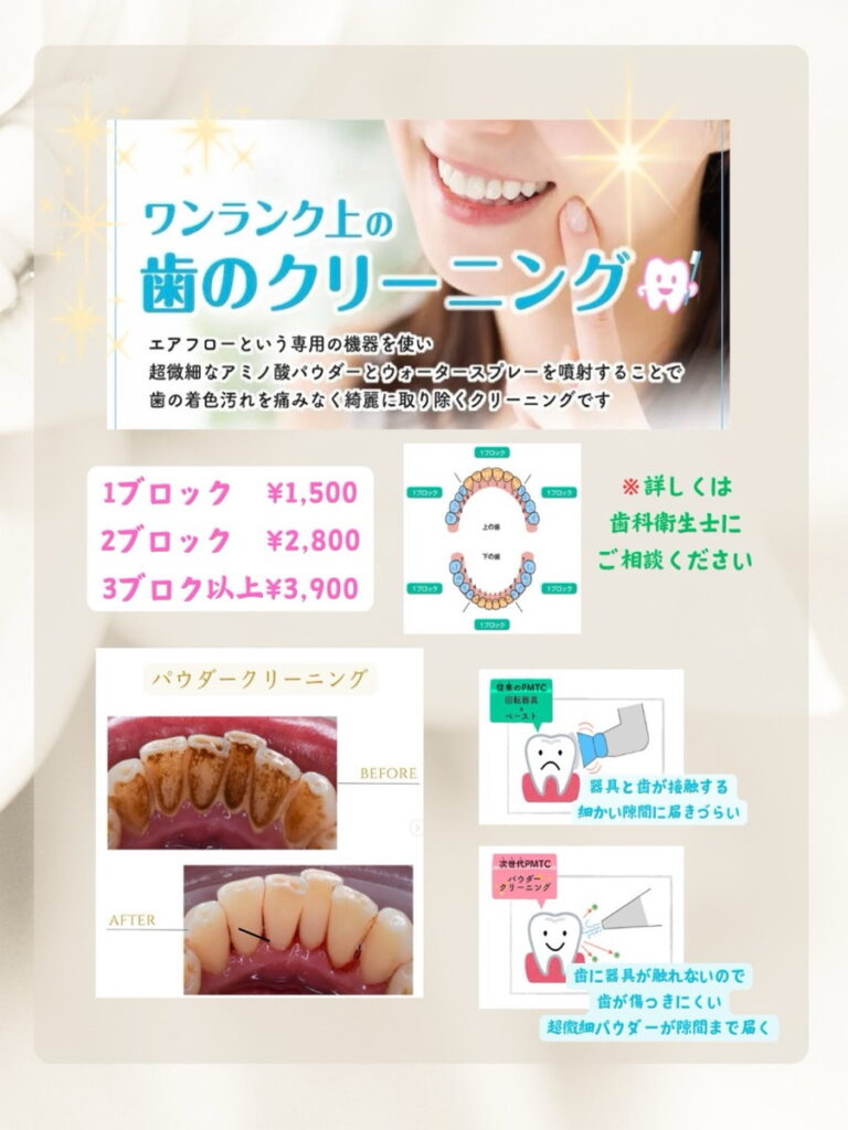 超微細なアミノ酸パウダーとウォータースプレーを噴射することで歯の着色汚れを痛みなくきれいに取り除くクリーニングです。