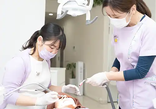 そして、歯科衛生士によるブラッシング指導で、患者さんのお口の状態やブラッシングの癖なども確認し、その方に合った磨き方、歯ブラシ指導を行っております。