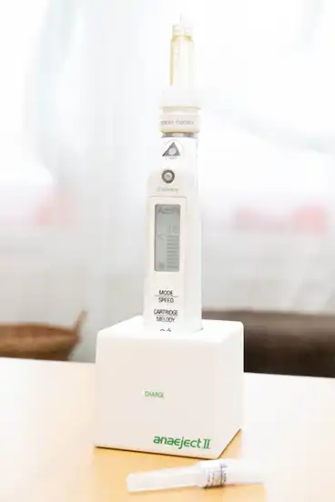 次に、電動麻酔です。電動麻酔では歯肉に注入する麻酔薬を電動でゆっくりと流していきます。そうすることによって麻酔薬が均一の量、スピードで注入され、注入時の痛みの軽減に繋がります。35Gというかなり細い注射針を採用しておりますので、注射針時の痛みを最小限に抑えられるよう配慮しております。